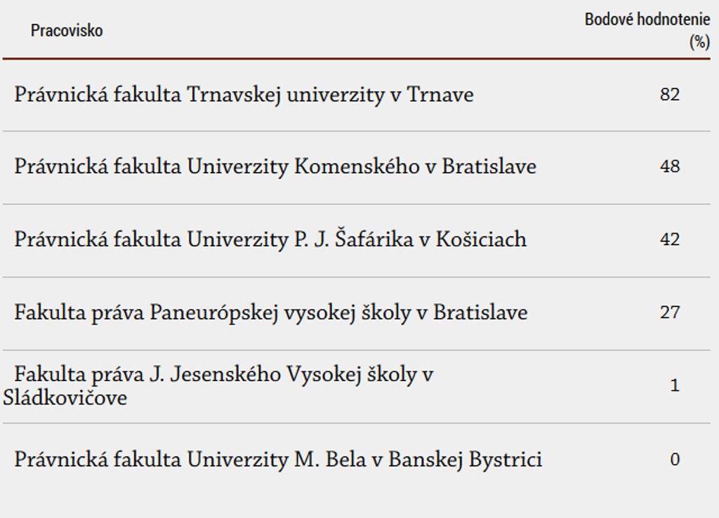 Dotazník vyplnilo celkovo 61 respondentov. Takmer polovica z nich pôsobí na Právnickej fakulte Trnavskej univerzity. "Vedeli sme, že fakulta, z ktorej sa zapojí najviac respondentov, by mohla byť zvýhodnená. Preto sme navrhli takú metodiku, ktorá to bude eliminovať," tvrdí Vančo.