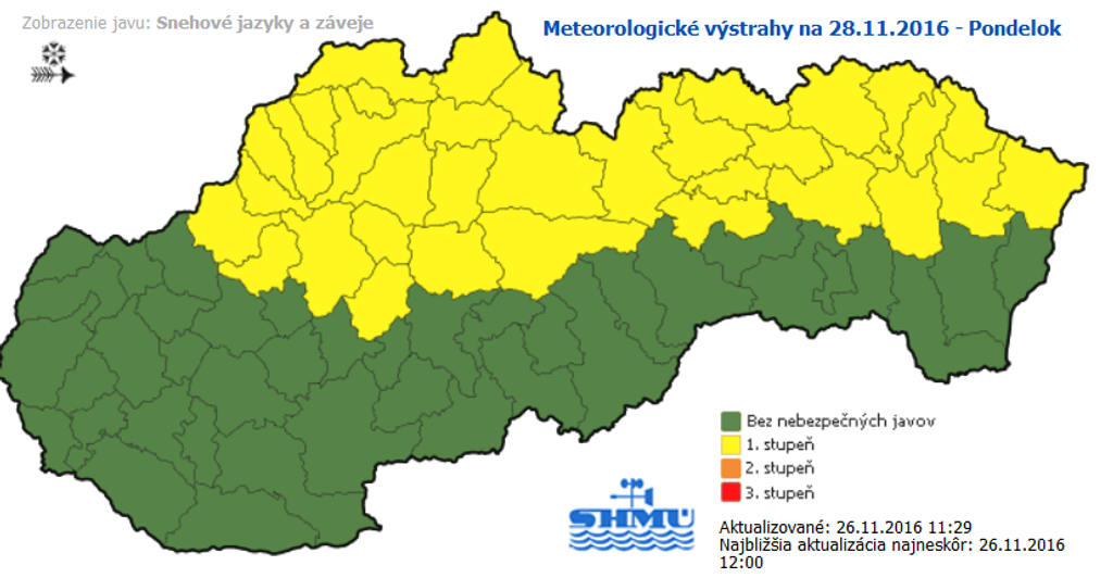So snehom súvisí aj dopravná situácia, ktorá bude komplikovaná hlavne na severe Slovenska. Meteorológovia zo SHMÚ už vydali výstrahu pred snehovými jazykmi a závojmi. Tie platia pre celý Žilinský a Prešovský kraj a okresy: