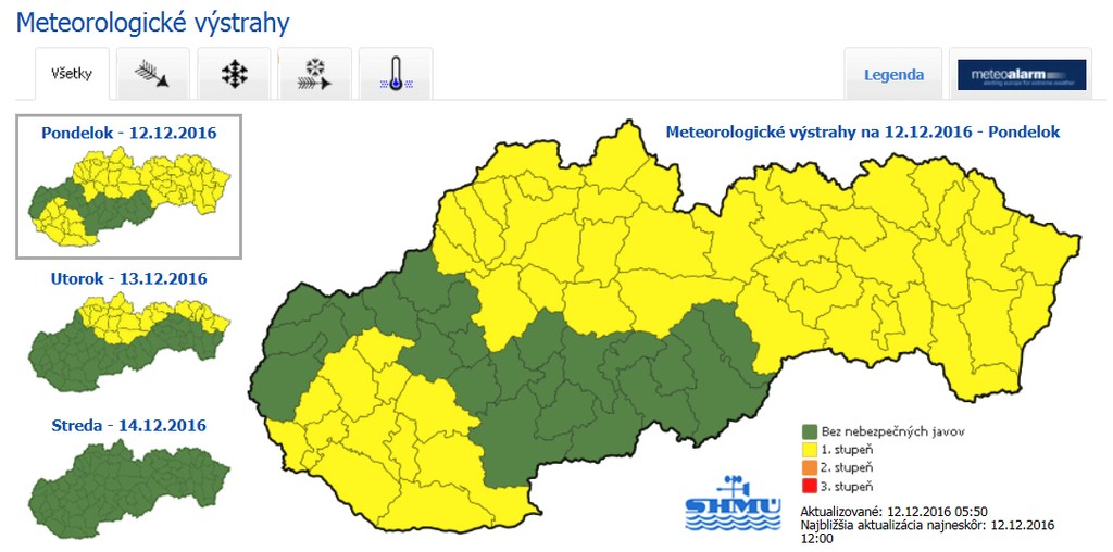 Dnes bude oblačno až zamračené, popoludní miestami, najmä v južnej polovici Slovenska zmenšovanie oblačnosti. Na mnohých miestach dážď alebo dážď so snehom. Od cca 600 m, postupne aj v nižších polohách, sneženie. Na severe sa môžu začať tvoriť snehové jazyky, popoludní od severu výrazne ochladzovanie! Najvyššia denná teplota 3 až 7 stupňov, na severe okolo 1 stupeň. Fúkať bude západný až severozápadný, popoludní postupne prevažne severný vietor okolo 10 až 30 km/h, 35 km/h, v nárazoch ojedinele okolo 65 km/h. Na horách prudký vietor až víchrica.