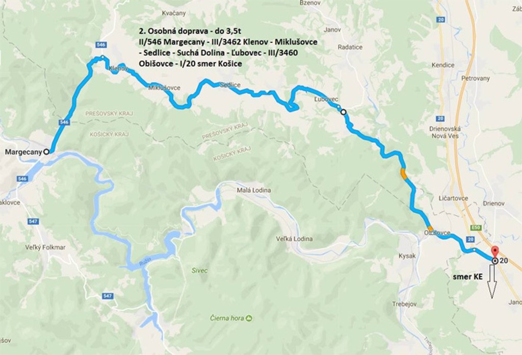 Margecany - Klenov - Miklušovce - Sedlice - Suchú Dolinu - Ľubovec - Radatice - Bzenov - Prešov - smer Košice. Pre osobnú dopravu do 3,5 tony vedie obchádzková trasa cez Margecany - Klenov - Miklušovce - Sedlice - Suchú Dolinu - Ľubovec - Ruské Pekľany - Obišovce - smer Košice.