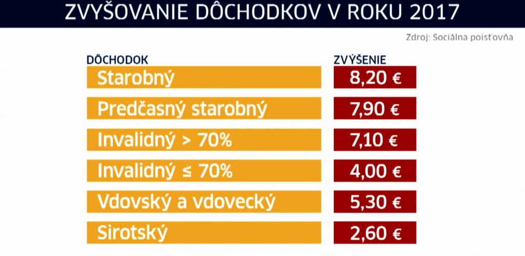 Od janurára dostane aspoň o trochu vyššie dôchodky asi 1 400 000 dôchodcov. V praxi sa budú dôchodky zvyšovať o pevnú sumu. Napríklad starobný penzisti si prilepšia o 8,20 eura. Necelých osem eur dostanú tí, ktorí odišli na penziu predčasne a najmenej iba o 2,60 eura sa zvýši sirotský dôchodok.