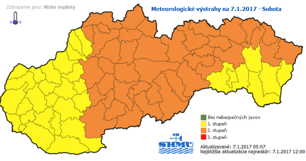 Mrazy na Slovensku udreli poriadnou silou. Teploty klesajú hlboko pod nulu, situáciu zhoršuje aj silný vietor. Meteorológovia však nemajú dobré správy ani pre ďalšie dni. Výstrahy pred nízkymi teplotami vydali pre celé Slovensko, dokonca ich v niektorých okresoch zvýšili až na druhý stupeň.