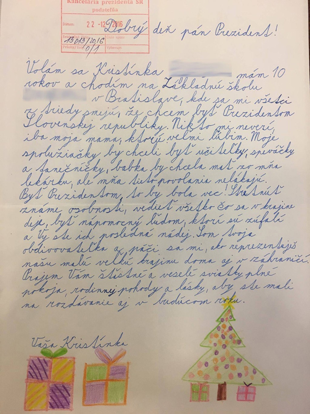 Pred Vianocami dostal krásny list od 10-ročnej Kristínky, ktorá ho pochválila za reprezentáciu Slovenska doma i v zahraničí. "Som Tvoja obdivovateľka a páči sa mi, ako reprezentuješ našu malú veľkú krajinu doma aj v zahraničí, pochválila hlavu štátu školáčka. Dokonca sa mu priznala, že chce byť prezidentka.
