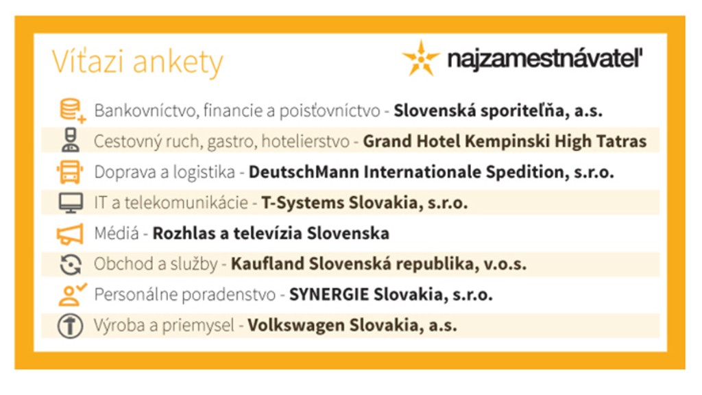 Spoločnosť Profesia zverejnila výsledky najlepších zamestnávateľov za uplynulý rok. V ankete hlasovalo celkom 17 070 ľudí, ktorí si vyberali najatraktívnejšieho zamestnávateľa spomedzi 133 nominovaných firiem v ôsmich kategóriách.