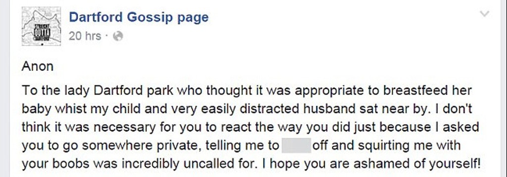 "Pre dámu z parku v Dartforde, ktorá si myslela, že bolo vhodné dojčiť svoje dieťa pred zrakom mojho potomka a manželom, ktorého rozptyľovala. Myslím si, že potom ako som vás slušne požiadala, či nemôžete ísť niekam do súkromia, bolo nemiestne povedať mi aby som šla do p... a streknúť na mňa mlieko z vášho prnsíka. Dúfam, že sa poriadne hanbíte," napísala.
