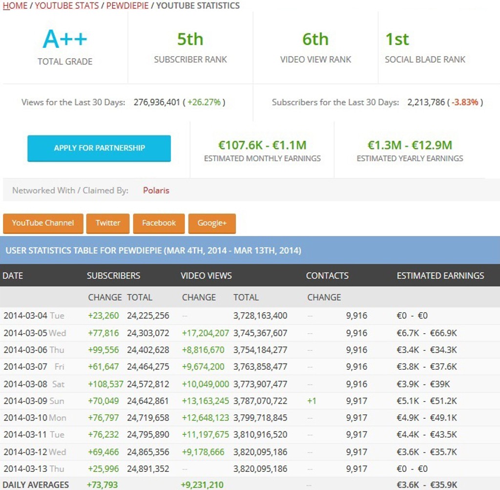 Analytická spoločnosť SocialBlade zostavuje rebríček tých „naj" z celého sveta. Užívateľ PewDiePie podľa nej môže za rok zarobiť až 12,9 mil. eur. Taký plat nemajú ani televízne hviezdy a na YouTube toľko peňazí nezarobí Justin Bieber.
