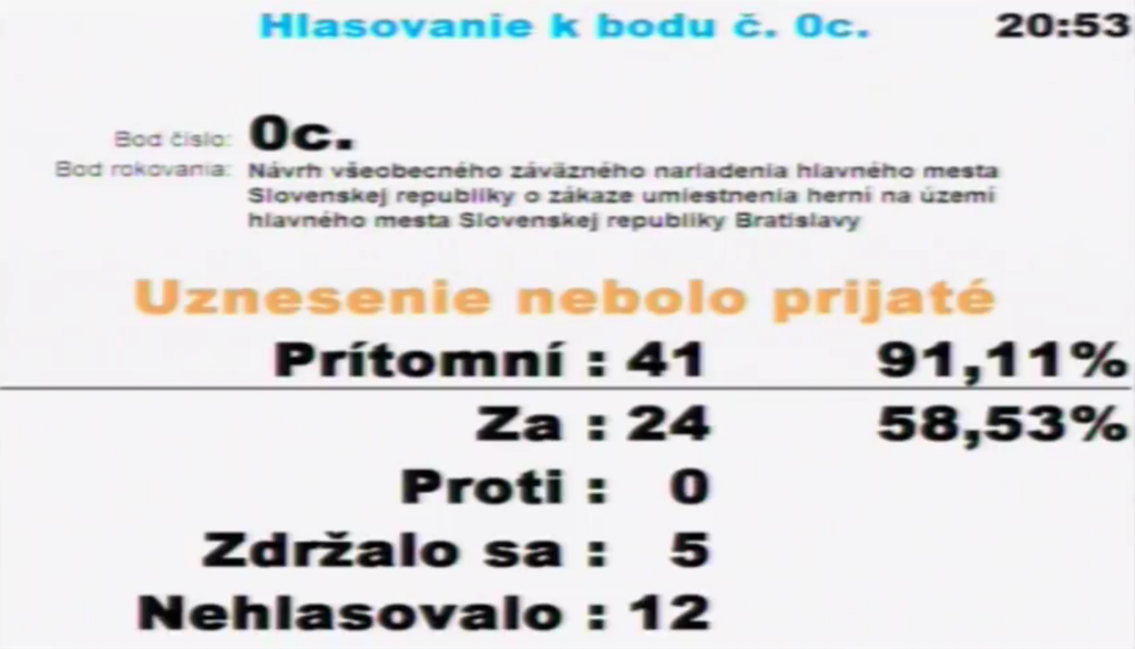 Bratislavskí mestskí poslanci dnes neschválili absolútny zákaz umiestnenia herní na celom území hlavného mesta. Herne sa tak budú môcť nachádzať v hoteloch, penziónoch, bytových domoch, pohostinstvách, v budovách pre obchod, kultúru či na verejnú zábavu. Zo 41 prítomných poslancov hlasovalo za zákaz hazardu 24, nehlasovali 12 a piati sa zdržali.
