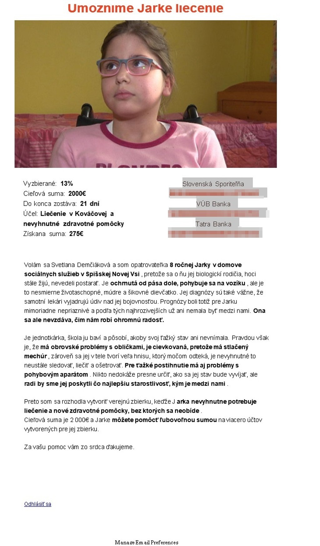 Na falošnú zbierku nás upozornili čitatelia. Ak chcete Jarke pomôcť, obráťte sa na portál ďakujeme.sk, kde nájdete Jarkin príbeh. Doteraz ste tomuto čipernému dievčatku prispeli sumou 7075 eur.