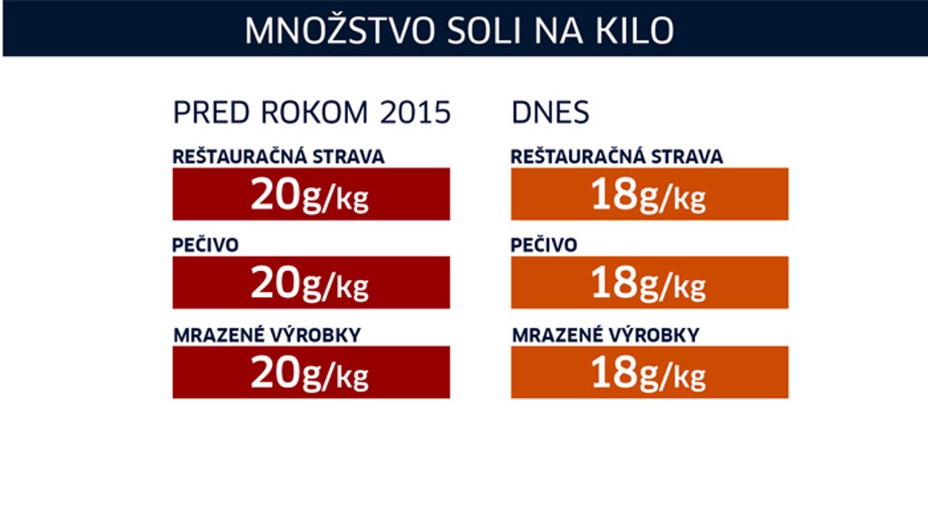 Na Slovensku od decembra 2015 platí vyhláška úradu verejného zdravotníctva. V určitých komoditách museli výrobcovia potravín znížiť obsah pridávanej soli. Maximálny limit sa z 20 gramov soli na kilo zmenil na 18.