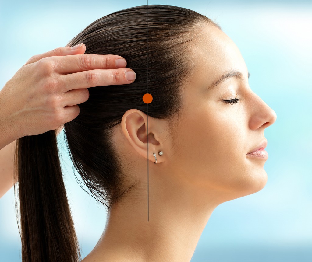 Nahmatáte ich dva až tri centimetre nad uchom medzi vlasmi. Jemne masírujte a zbavíte sa bolesti a pocitu unavených očí.
