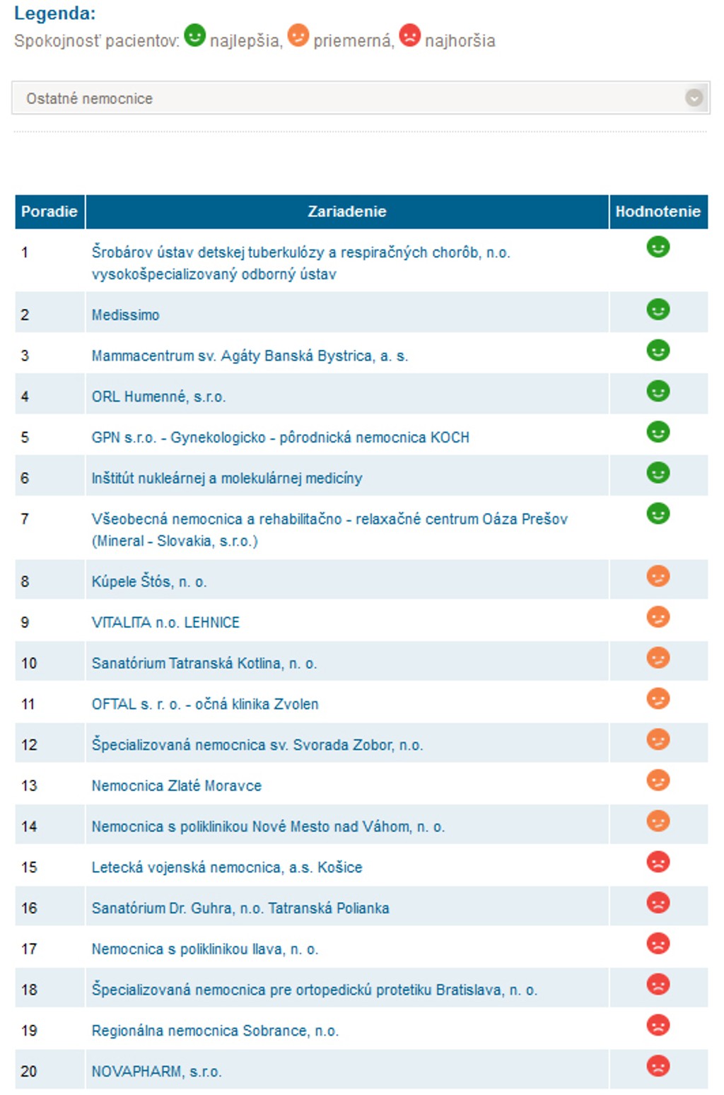 Štátna Všeobecná zdravotná poisťovňa výsledky prieskumu za minulý rok ešte spracováva.Za rok 2015 však jej poistenci najlepšie ohodnotili ORL Humenné, Kardiocentrum v Nitre a Mammacentrum sv. Agáty ProCare v Banskej Bystrici. Na chvoste rebríčka skončili Fakultná nemocnica s poliklinikou Žilina, Nemocnica s poliklinikou Sv. Lukáša Galanta a GEMERCLINIC Hnúšťa. VšZP oslovila 20-tisíc poistencov, na dotazníky odpovedalo 29 percent z nich.