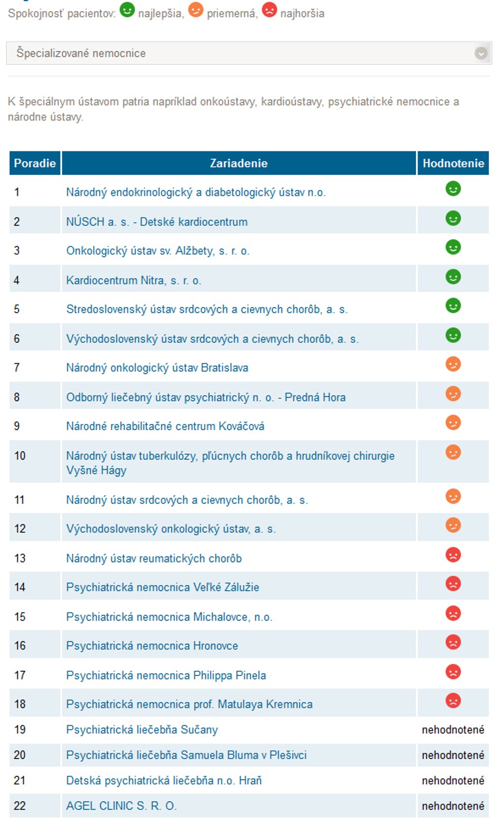 Medzi špecializovanými zase bodoval Národný endokrinologický a diabetologický ústav, najhoršiu známku získala Psychiatrická nemocnica prof. Matulaya Kremnica.