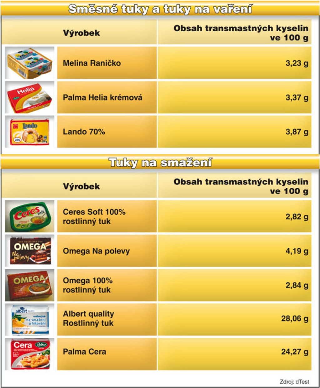 Vôbec najhoršie v tomto smere v teste časopisu dTest dopadol Albert quality Rastlinný tuk a Palma Cera. Prvý z menovaných výrobkov obsahoval 28 gramov transmastných kyselín v sto gramoch tuku, v druhom potom ich množstvo bolo 24,27 gramov na sto gramov tuku. Výsledky prekvapili aj lekára .