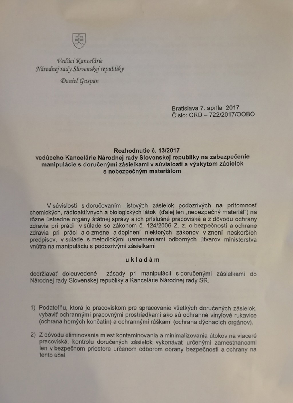 Kancelária Národnej rady SR a jej zamestnanci v žiadnom prípade zámerne neporušujú ústavné právo na zachovanie listového tajomstva. Každá podozrivá zásielka, však musí byť aj podľa pravidiel ochrany ústavných činiteľov preverená.