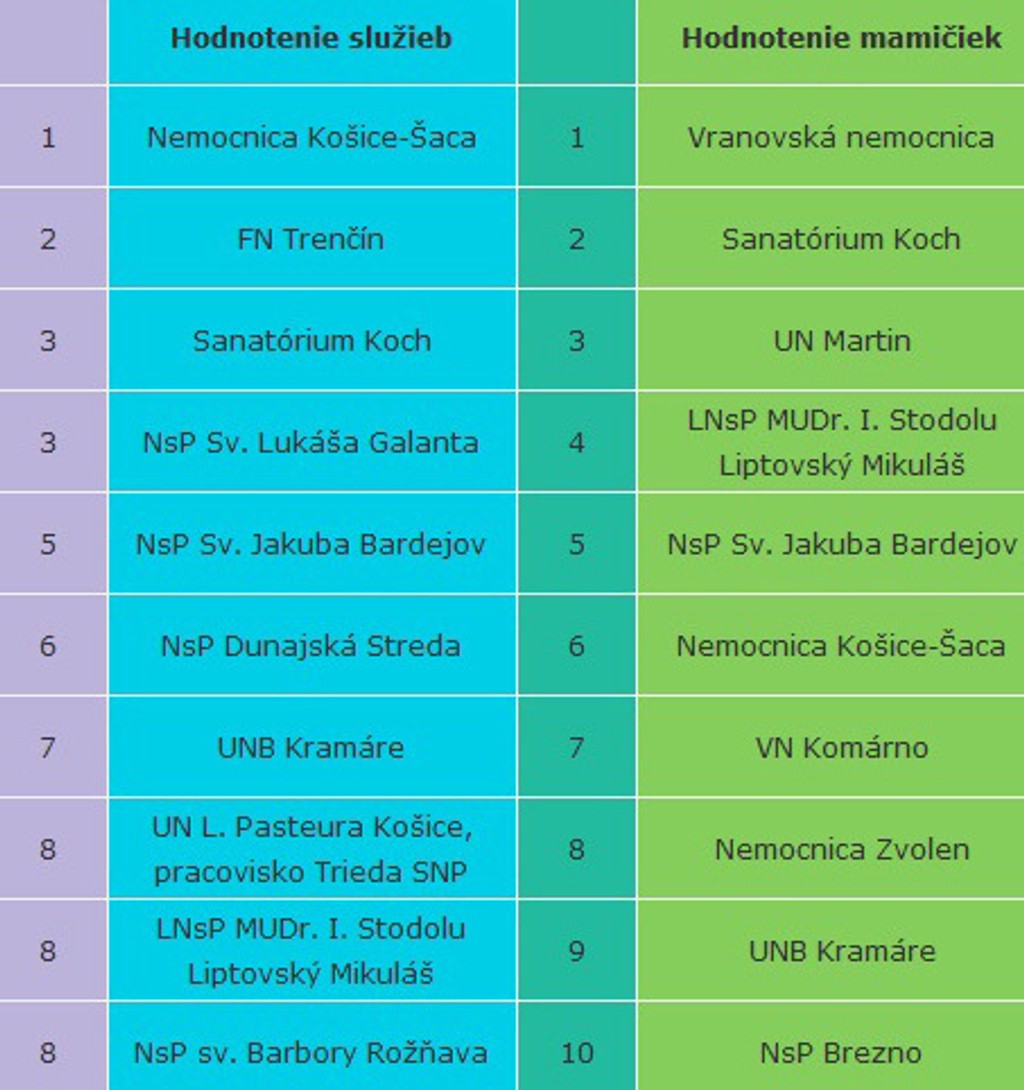Mamičky aj experti hodnotili prácu pôrodníc v minulom roku a prostredníctvom projektu Sprievodca pôrodnicami 2013 vznikli štyri rebríčky - celkové hodnotenie, pohľad expertov, pocity matiek a ponúkané služby.