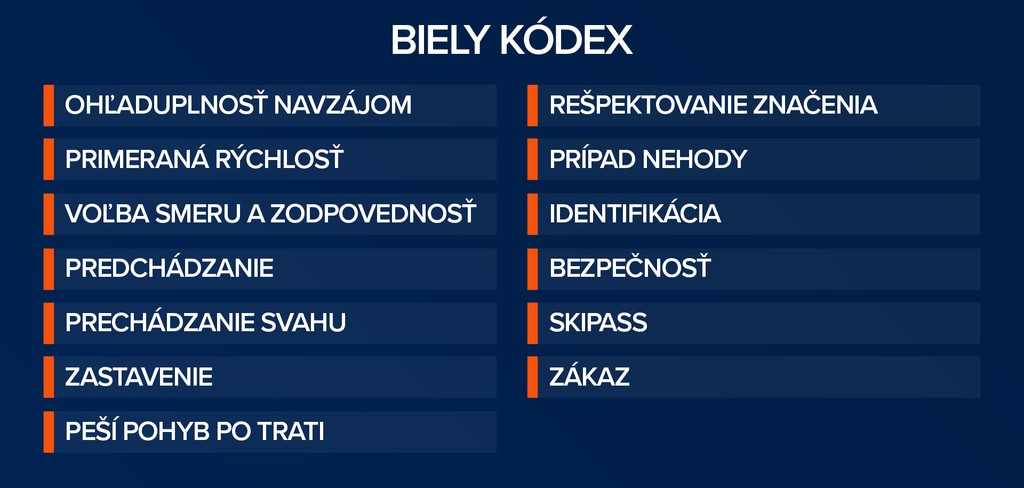 S lyžovaním sa spájajú pravidlá. Chránia ostatných na trati, tak ako aj nás. Človek sa k ich dodržiavaniu zaväzuje kúpou skipasu, použitím prepravného zariadenia alebo vstupom do areálu lyžiarskeho strediska. Každý návštevník má povinnosť oboznámiť sa s Bielym kódexom a správať sa podľa neho, inak hrozí vykázanie zo strediska.