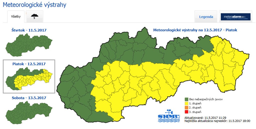 Meteorológovia v tejto súvislosti vydali výstrahu prvého stupňa s platnosťou v piatok (12.5.) od 06.00 h do 12.00 h pre Nitriansky a Trenčiansky kraj, od 08.00 do 20.00 h pre Banskobystrický a od 10.00 do 20.00 h pre Košický a Prešovský kraj.