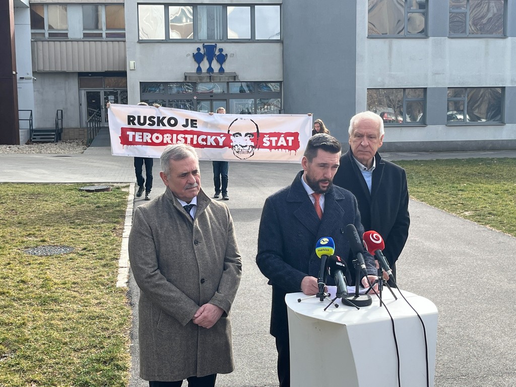 Počas ich tlačovej besedy pred budovou SOŠV sa za nich postavili aktivisti zo skupiny Mier Ukrajine s transparentom, na ktorom je napísané, že „Rusko je teroristický štát“.