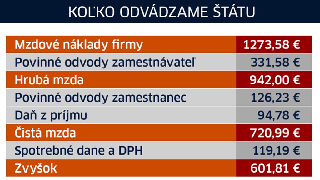 Zarábate napríklad 942 eur v hrubom. No firmu stojíte už vtedy aj kvôli vysokým odvodom omnoho viac. Potom si zaplatíte povinné odvody na zdravotné, dôchodkové či nemocenské poistenie aj vy. K tomu dane z príjmu a na výplatnej páske svieti v čistom 720 eur. Tu sa však zdaňovanie nekončí. Pri každom jednom nákupe platíte dph a navyše aj spotrebné dane. Až po odpočítaní týchto daní zostane na skutočne vlastné potreby.