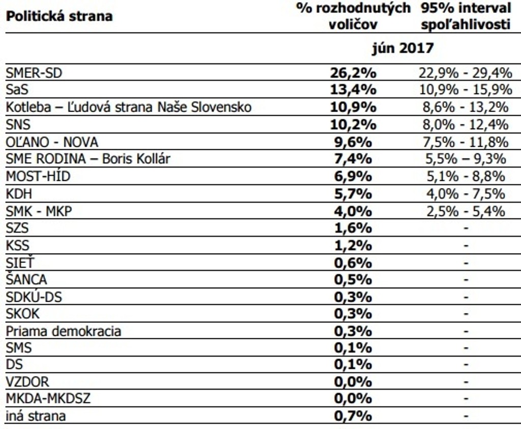 Smer by volilo viac ako 26 percent ľudí. Za ním nasleduje SaS s 13,4 percentami. Tretiu pozíciu si stále udržuje ĽSNS s takmer 11 percentami, čo je nárast o jedno percento oproti aprílovému prieskumu.