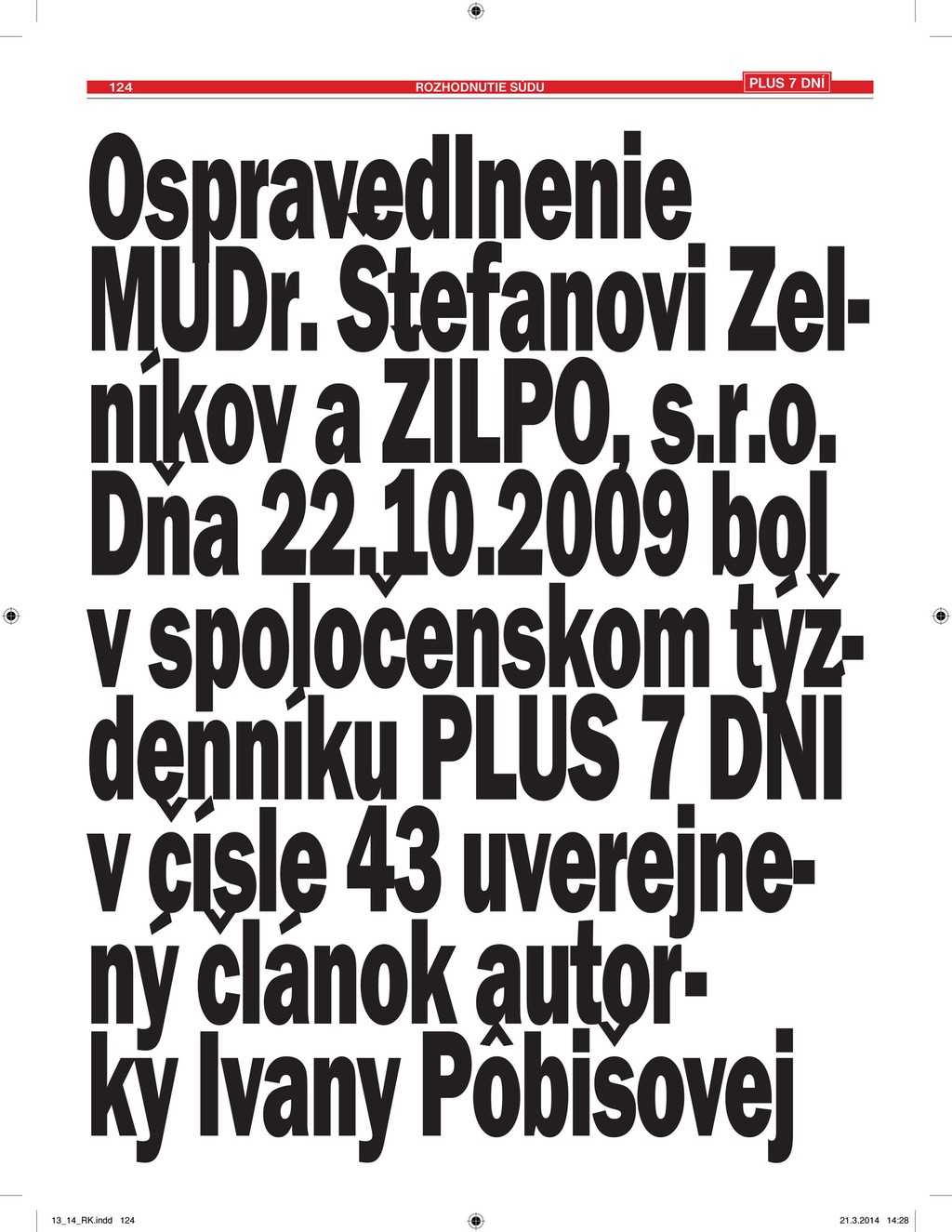 Ospravedlnenie si v tejto absolútne netradičnej podobe nepredstavoval ani Zelník. "Ja som len chcel, aby bolo uverejnené v rovnakej podobe a na rovnakom mieste, ako pôvodný článok. Toto mi ani nenapadlo," reagoval pre Aktuálne.sk. Zároveň však zdôraznil, že sa týždenník ospravedlňuje po dlhom čase. Právoplatný rozsudok totiž padol ešte vlani.