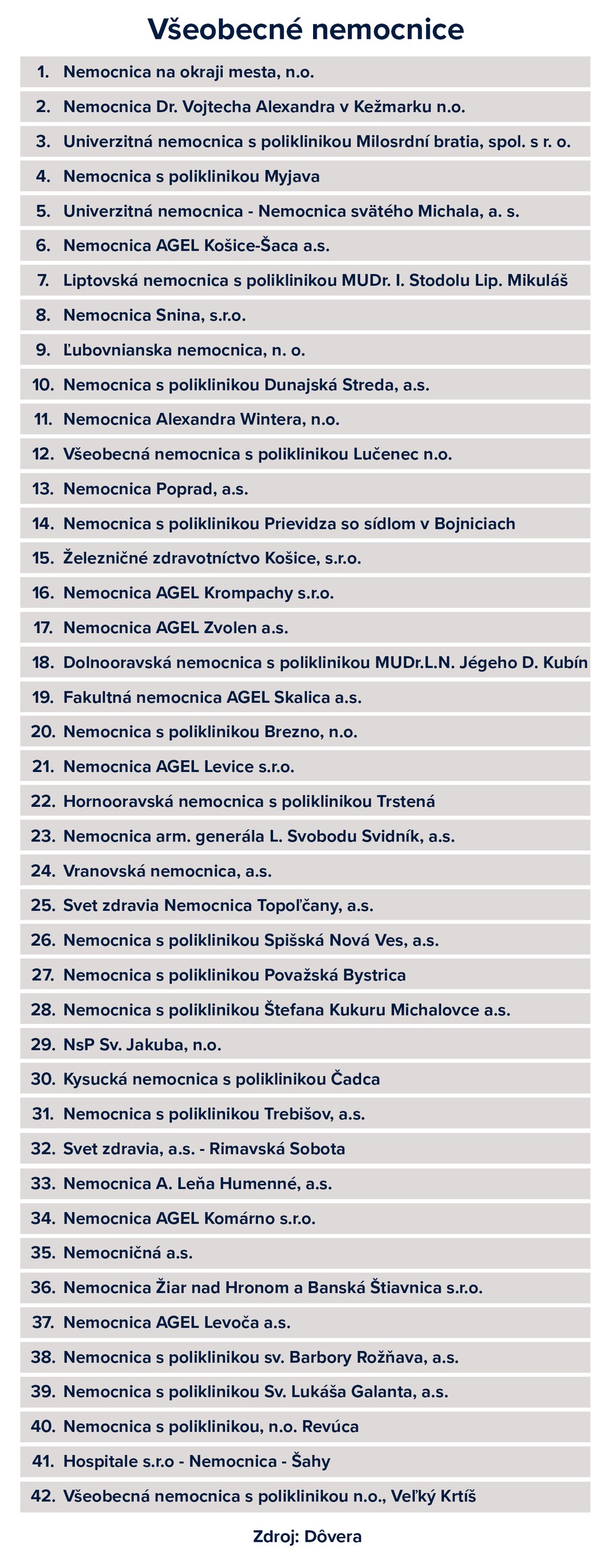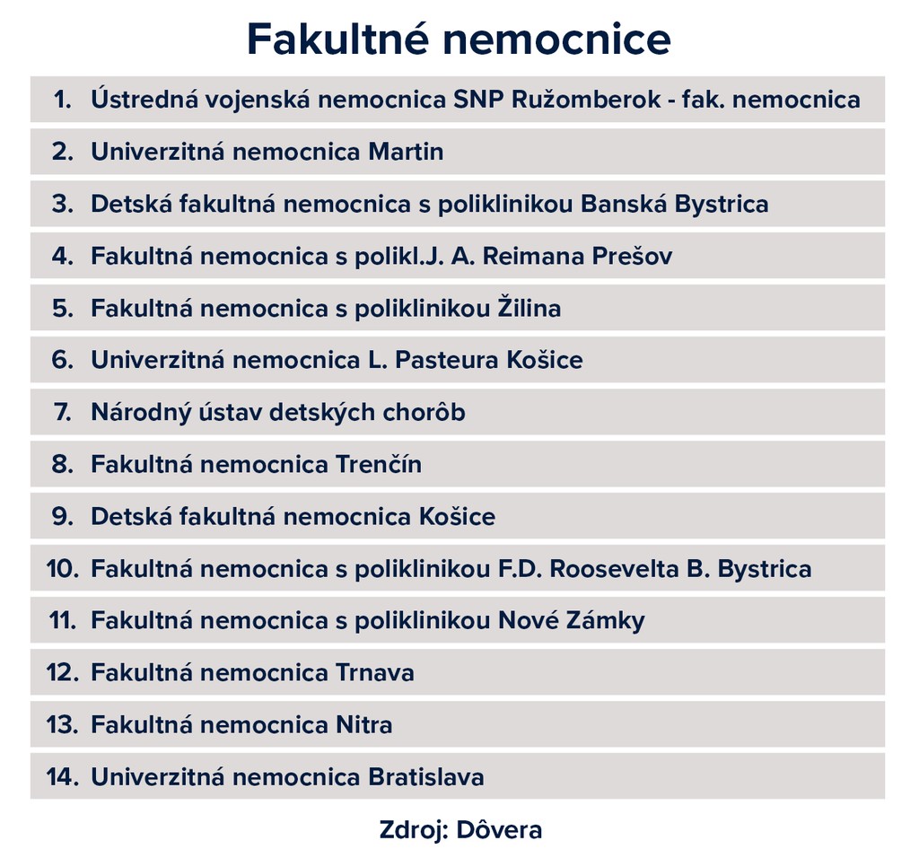 Hospitalizovaní pacienti najlepšie hodnotia z fakultných nemocníc Ústrednú vojenskú nemocnicu SNP Ružomberok a zo všeobecných zas Nemocnicu Partizánske. Naopak, najhoršie dopadli Univerzitná nemocnica Bratislava a Všeobecná nemocnica s poliklinikou Veľký Krtíš. Ukázal to rebríček súkromnej zdravotnej poisťovne Dôvera.