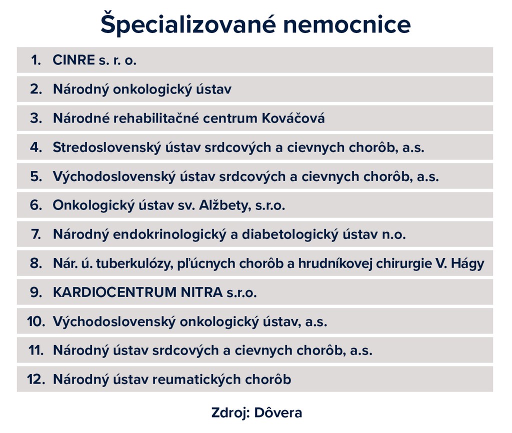 Pri špecializovaných zdravotníckych zariadeniach bola najlepšie hodnotená Cinre Bratislava. Z ostatných zdravotníckych zariadení sa v hodnotení pacientov najlepšie umiestnilo Mammacentrum sv. Agáty Banská Bystrica. Naopak, najhoršie dopadli Národný ústav reumatických chorôb a Špecializovaná nemocnica sv. Svorada Zobor, priblížil PR špecialista Matej Štepianský.