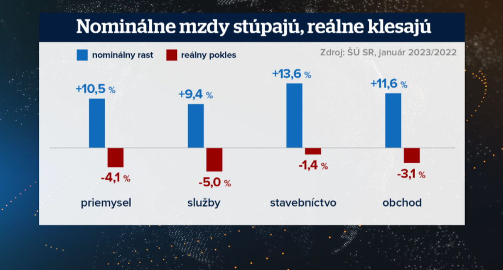 Inflácia prevyšuje rast platov aj v grafe znázornených štyroch odvetviach, kde pracuje najviac Slovákov.