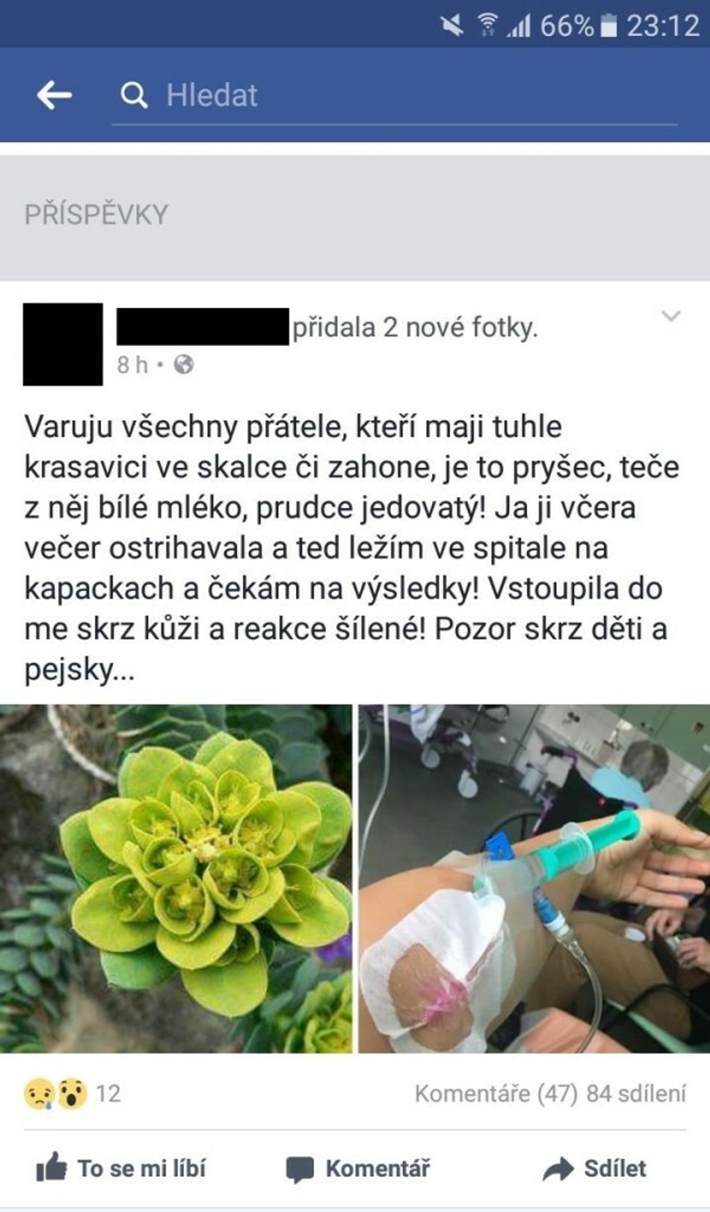 "Varujem všetkých priateľov, ktorí majú túto krásavicu v skalke, či záhone. Je to prýštec, tečie z neho biele mlieko, ktoré je prudko jedovaté. Strihala som ju a teraz ležím v nemocnici na infúziách a čakám na výsledky. Dostala sa mi do tela cez kožu a reakcia bola šialená. Pozor na deti a psíkov, " napísala na sociálnej sieti záhradkárka zo Zlínska.