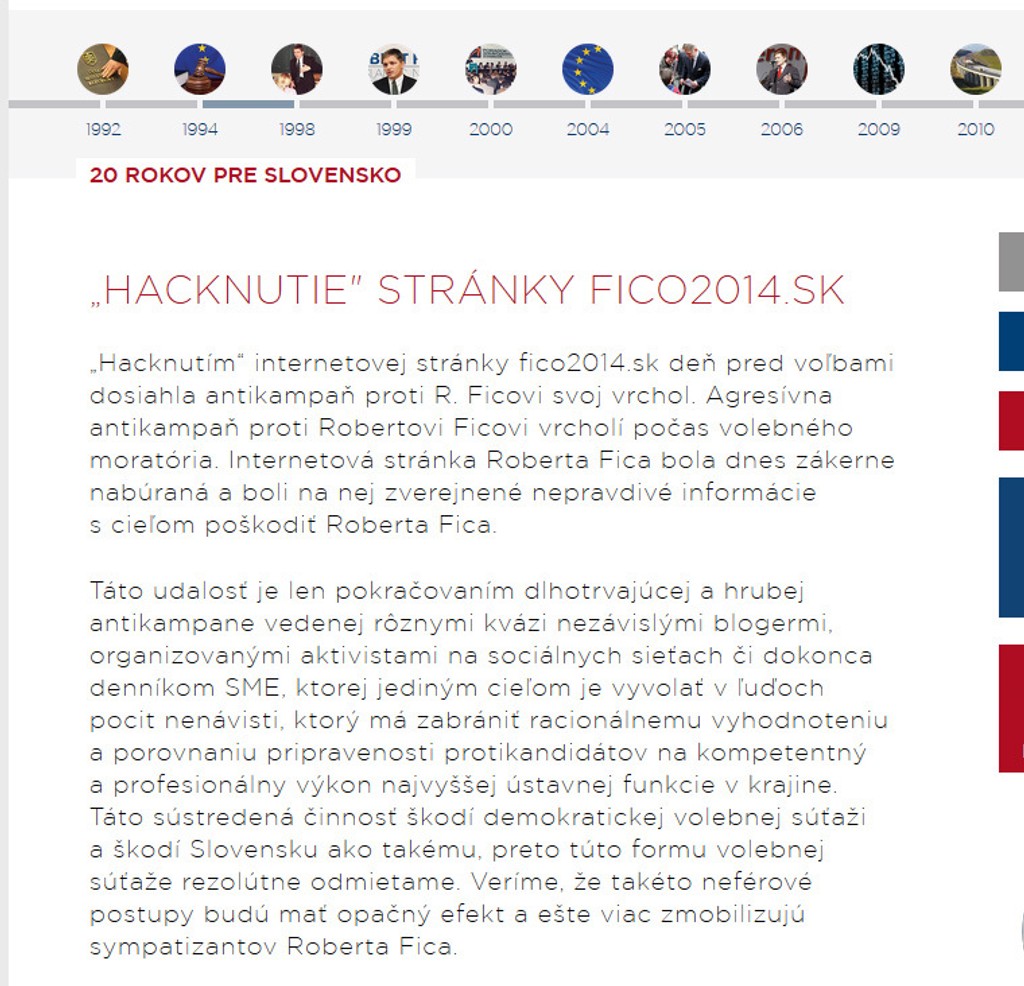 "Rovnosť prezidentských kandidátov tak bola významným spôsobom narušená. Strana SMER- sociálna demokracia vníma útok neznámeho hackera ako vrchol agresívnej antikampane namierenej proti prezidentskému kandidátovi Robertovi Ficovi," píše v stanovisku poskytnutom pre novinárov Ľubica Končalová z tlačového odboru socialistov.