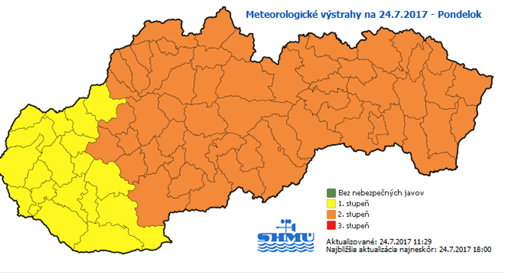 Najohrozenejšie okresy sú - na dnes (24.7.) a utorok (25.7.) - v Nitrianskom, Trenčianskom, Banskobystrickom, Žilinskom, Prešovskom a Košickom kraji.