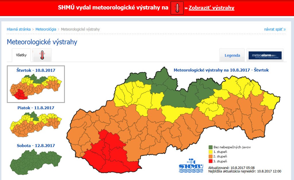 Slovensku dnes opäť hrozia tropické horúčavy. Slovenský hydrometeorologický ústav vydal pre väčšinu Slovenska výstrahy od prvého po najvyšší tretí stupeň.