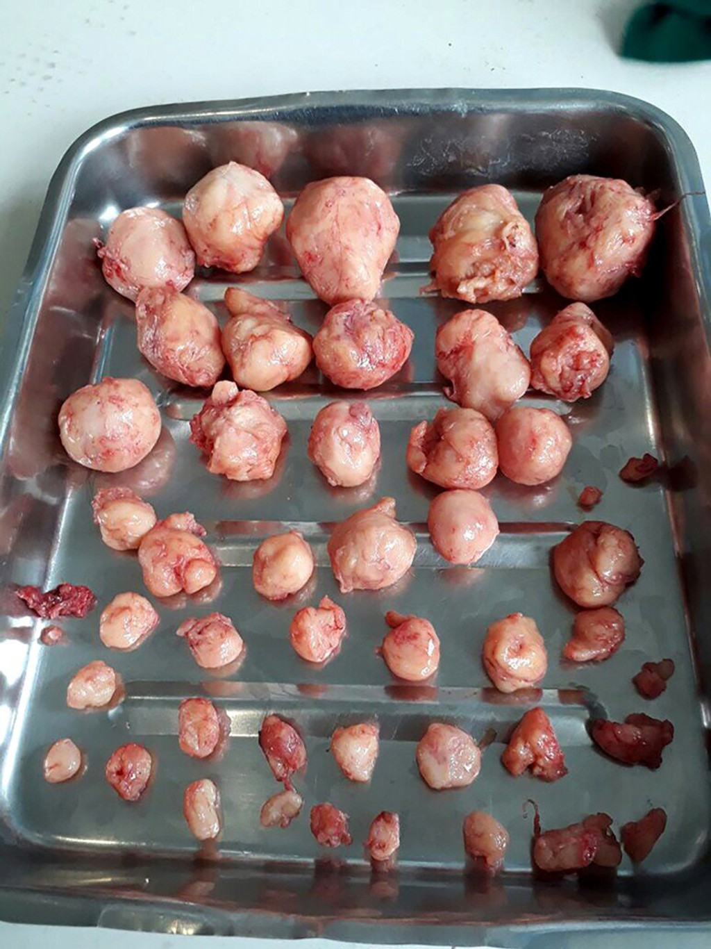 Lekári zistili príčinu a musela ísť pod skalpel. V nemocnici v meste Itánagar jej z maternice minulý týždeň (18. 8.) vyoperovali 50 nezhubných nádorov známych ako myómy. Maternica ostala po zákroku neporušená a plne funkčná. Celková hmotnosť nádorov bola 3,3 kilogramu.