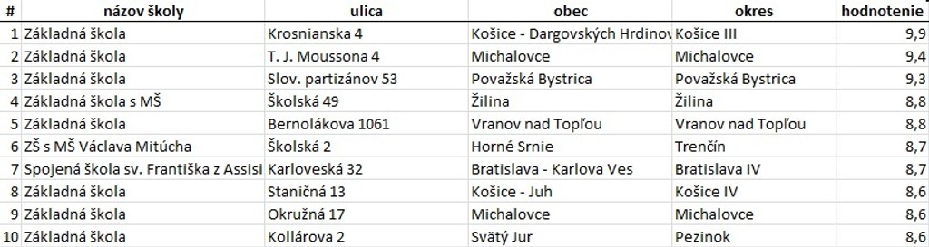 Je tu nový rebríček základných, stredných škôl a gymnázií. Najlepšie sa vo svojich kategóriách umiestnili Základná škola na Krosnianskej ulici v Košiciach, Obchodná akadémia v Trnave na Kukučínovej ulici a Škola pre mimoriadne nadané deti - Gymnázium na Teplickej ulici v Bratislave.