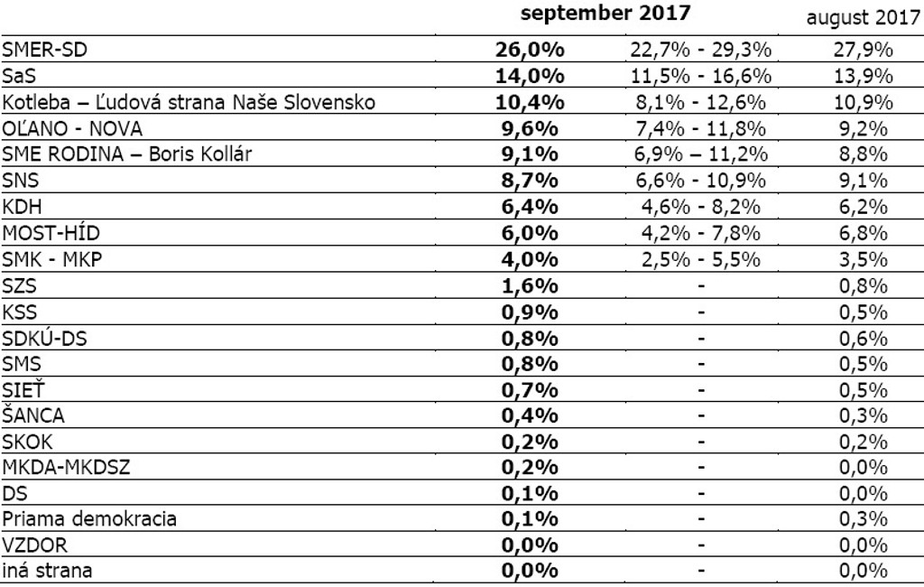 Prvú pozíciu si stále drží Smer-SD s 26 percentami. Prepadol sa tak o dve percentá oproti minulému mesiacu. Za ním nasleduje opozičná strana SaS so 14 percentami.