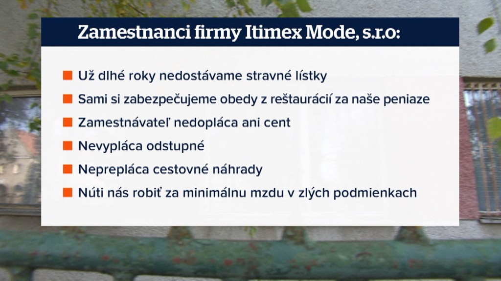 Konateľ firmy obvinenia odmieta. „Nevieme si predstaviť, že by naša spoločnosť neposkytla mzdu alebo mzdové zvýhodnenie za prácu nadčas, alebo že by neviedla evidenciu za prácu nad čas," uviedol Dušan Weis, konateľ firmy Itimex Mode, s.r.o..