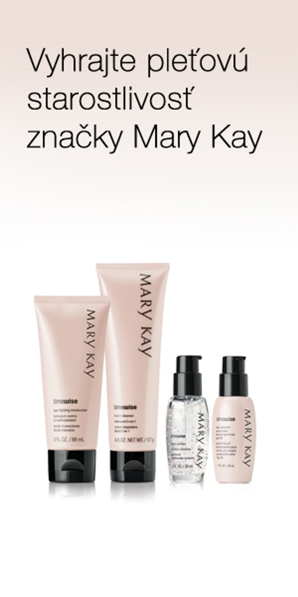 Kľúčovými zložkami týchto pleťových prípravkov značky Mary Kay je patentovaný komplex látok TimeWise®. Jednotlivé produkty majú jedinečné zloženie, vďaka ktorému tvoria systém starostlivosti o pleť s predčasnými až strednými známkami starnutia. Redukujú jemné linky a vrásky tým, že podporujú a urýchľujú prirodzený proces obnovy pleti.