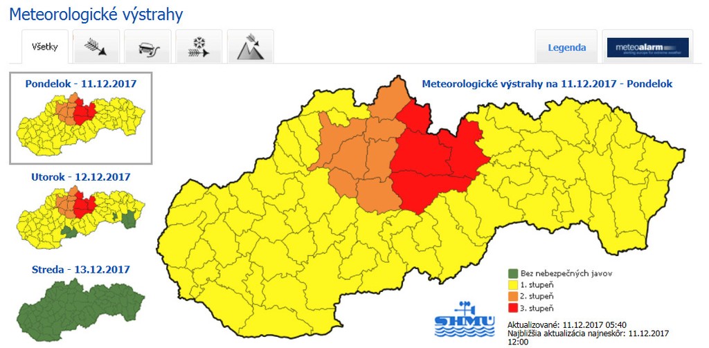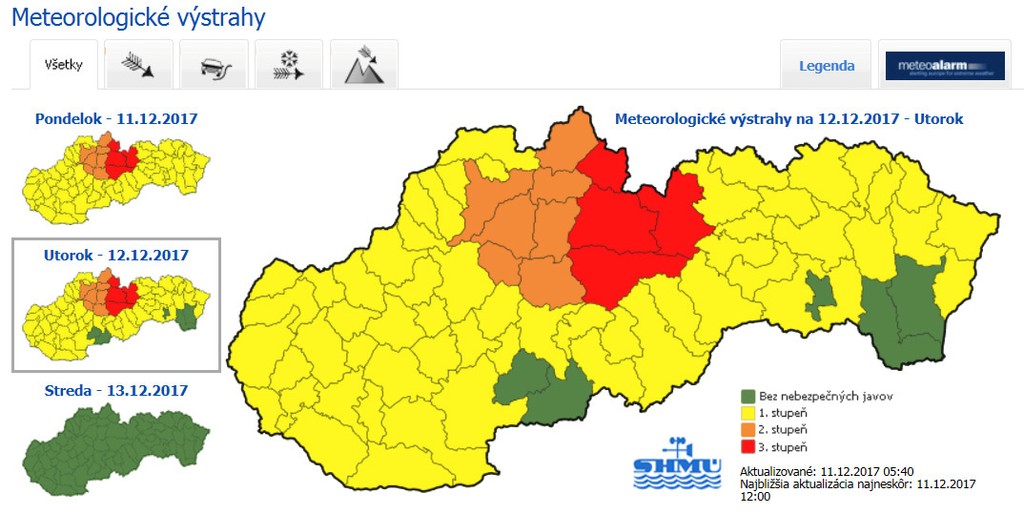 Slovenský hydrometeorologický ústav vydal na pondelok a utorok výstrahy najvyššieho stupňa kvôli silnému vetru. Varujú, že na niektorých miestach môže rýchlosť vetra dosiahnuť od 160 do 180 km/h. Najviac bude fúkať v okresoch Tvrdošín, Liptovský Mikuláš, Brezno a Poprad.