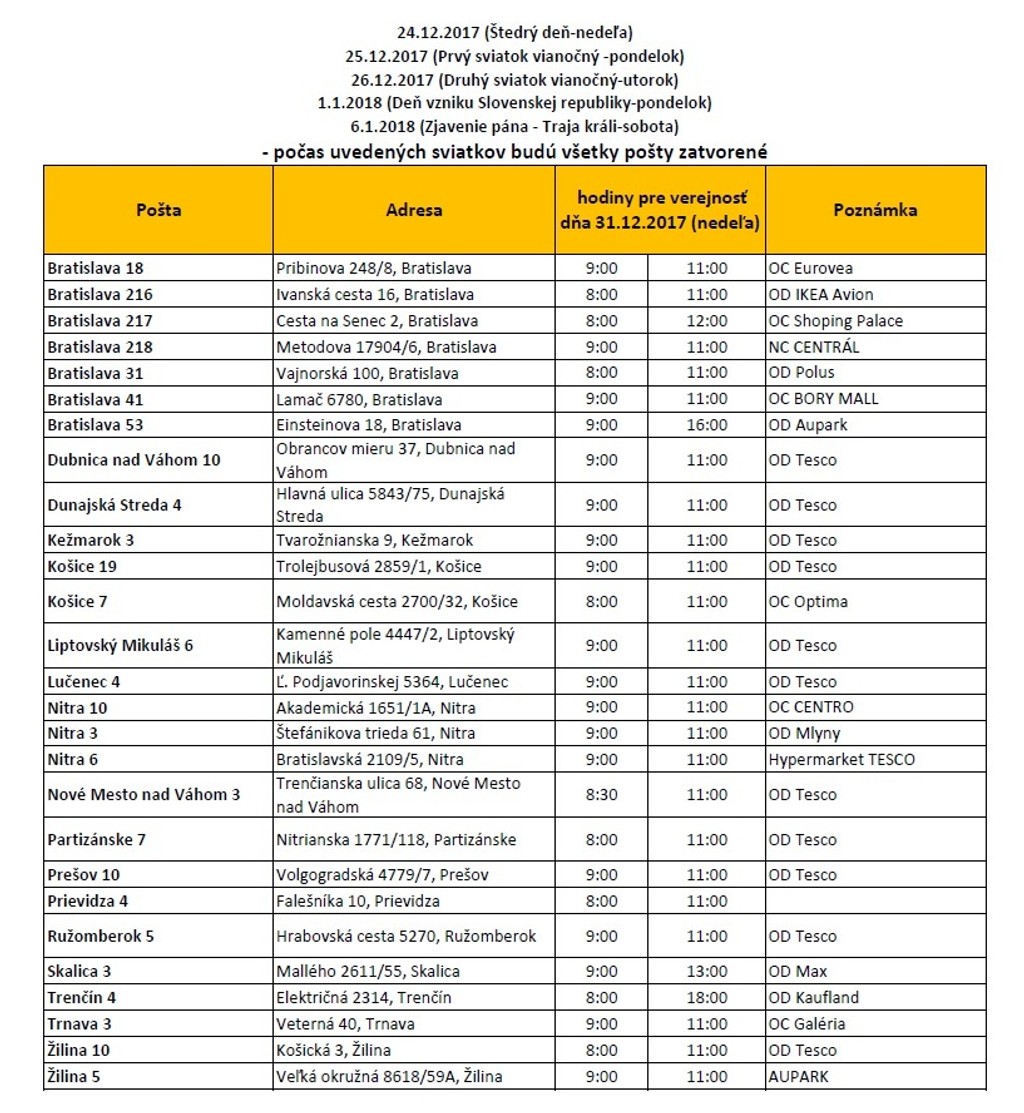 Počas vianočných sviatkov (nedeľa 24.12, pondelok 25.12, utorok 26.12.), na Nový rok (pondelok 1.1.2018) a na sviatok Troch kráľov (sobota 6.1.2018) budú všetky pošty na Slovensku zatvorené. V posledný deň roka 2017 (nedeľa 31.12.2017) budú pre verejnosť otvorené vybrané pošty.