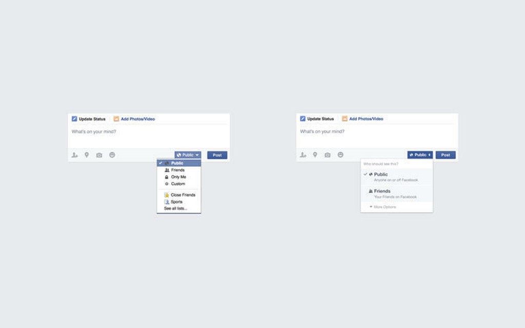 Užívatelia osobných počítačov pocítia takisto zmenu vo výbere publika. Namiesto všetkých možností sa budú zobrazovať už iba dve najpopulárnejšie - Public(verejný) a Priatelia. K zvyšným možnostiam sa dostanete až po rozbalení submenu.