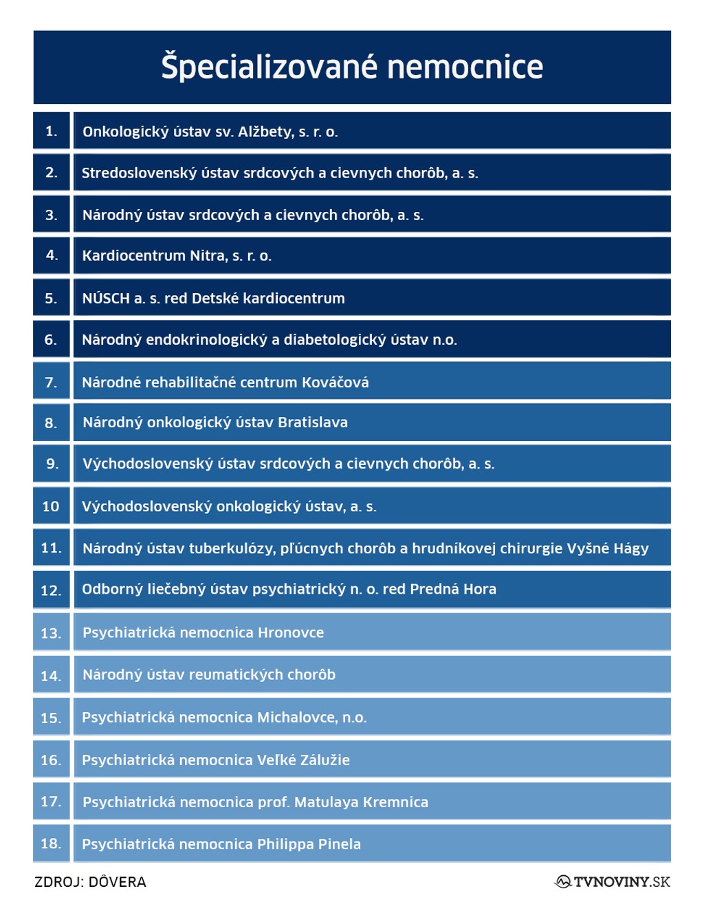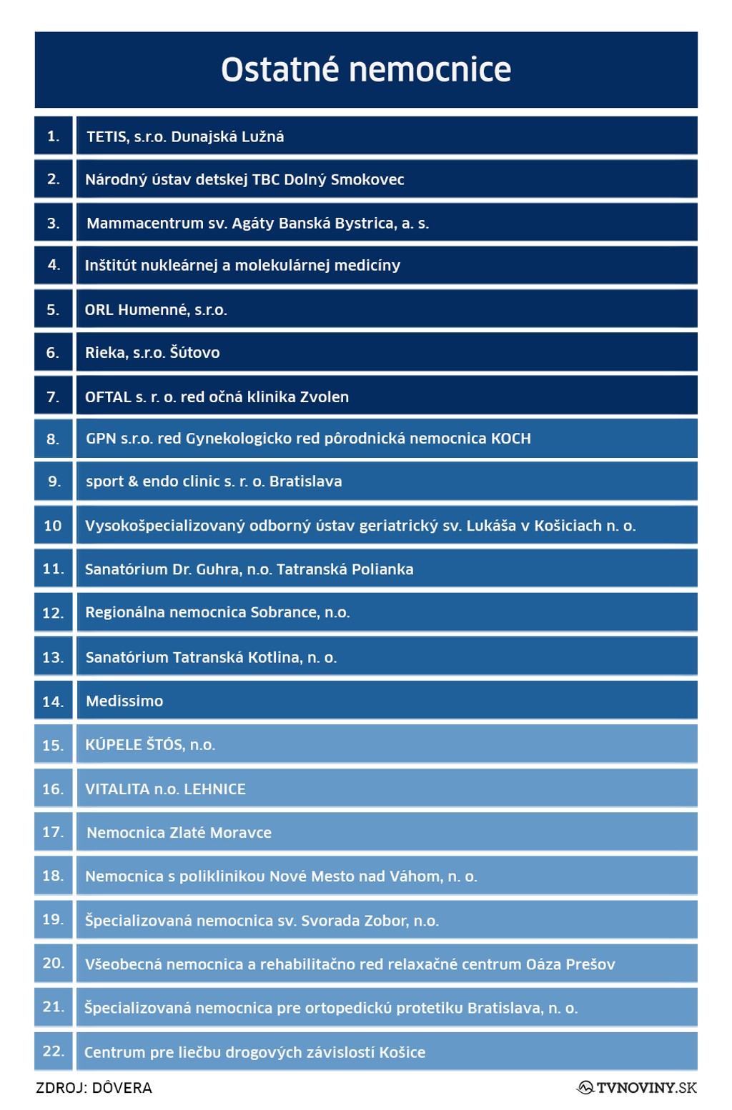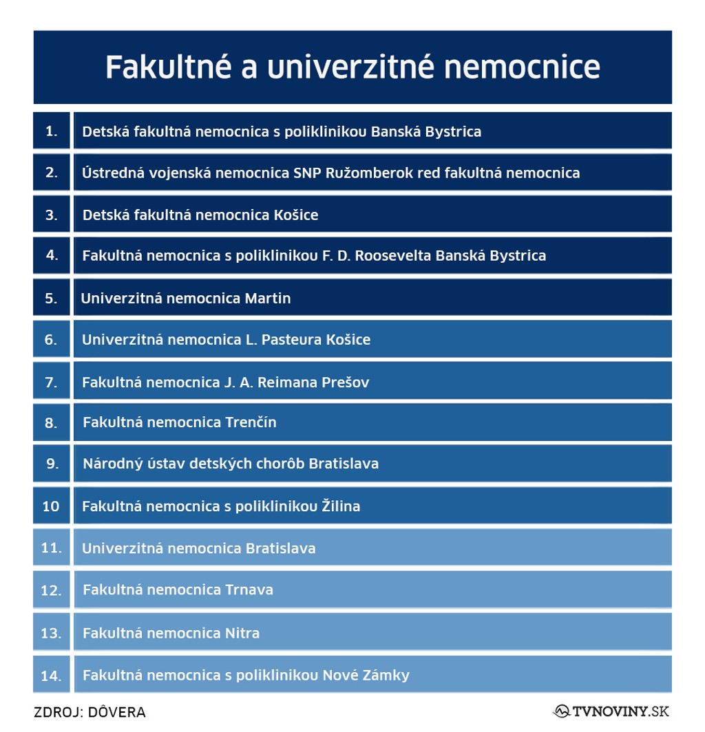 Medzi všeobecnými nemocnicami bodovala Nemocnica sv. Michala v Bratislave, Ľubovnianska nemocnica a Nemocnica arm. generála L. Svobodu Svidník. Obľúbené medzi pacientmi, naopak, nie sú Všeobecná nemocnica s poliklinikou Veľký Krtíš, Nemocnica Levice a Nemocnica Zvolen.
