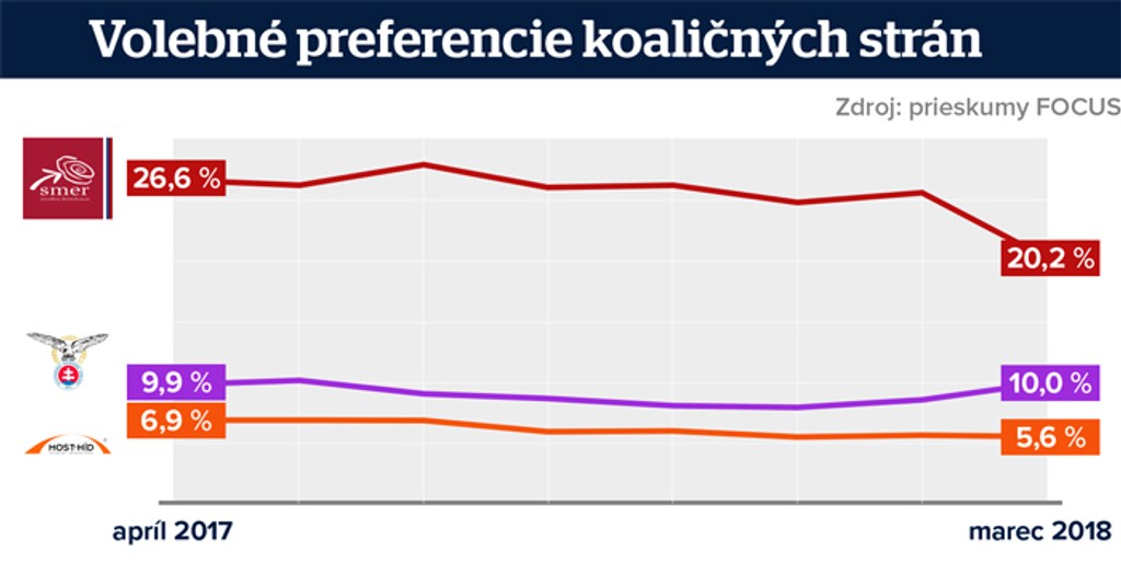Takto sa volebné preferencie vládnej trojice zmenili za uplynulý rok. Najsilnejší Smer stratil najviac, a to najmä teraz v marci.