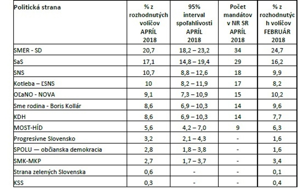 Ak by sa parlamentné voľby konali prvý týždeň v apríli, vyhral by ich vládny Smer-SD s 20,7 percentami. Za ním by skončili liberáli zo Slobody a Solidarita, ktorí by získali oproti poslednému prieskumu Focus viac a to 17 percent hlasov.