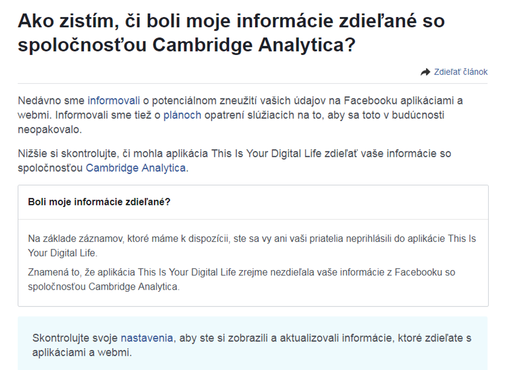 Dnes si to môžu skontrolovať aj užívatelia na Slovensku. Facebook v danej sekcii vyzýva užívateľov, aby si skontrolovali, či mohla aplikácia This Is Your Digital Life zdieľať informácie s firmou Cambridge Analytica.
