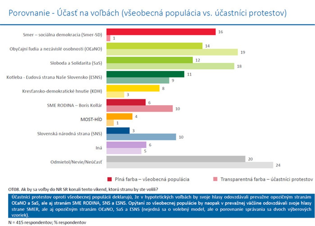 Účastníci protestov podľa Medianu deklarujú, že v hypotetických voľbách by v prevažnej väčšine odovzdali svoje hlasy OĽaNO a SaS, ale aj Sme rodina, SNS a ĽS NS. Naopak, ľudia zo všeobecnej populácie v prieskume povedali, že by hlasy dali Smeru-SD, ale opozičným stranám OĽaNO, SaS a ĽS NS.
