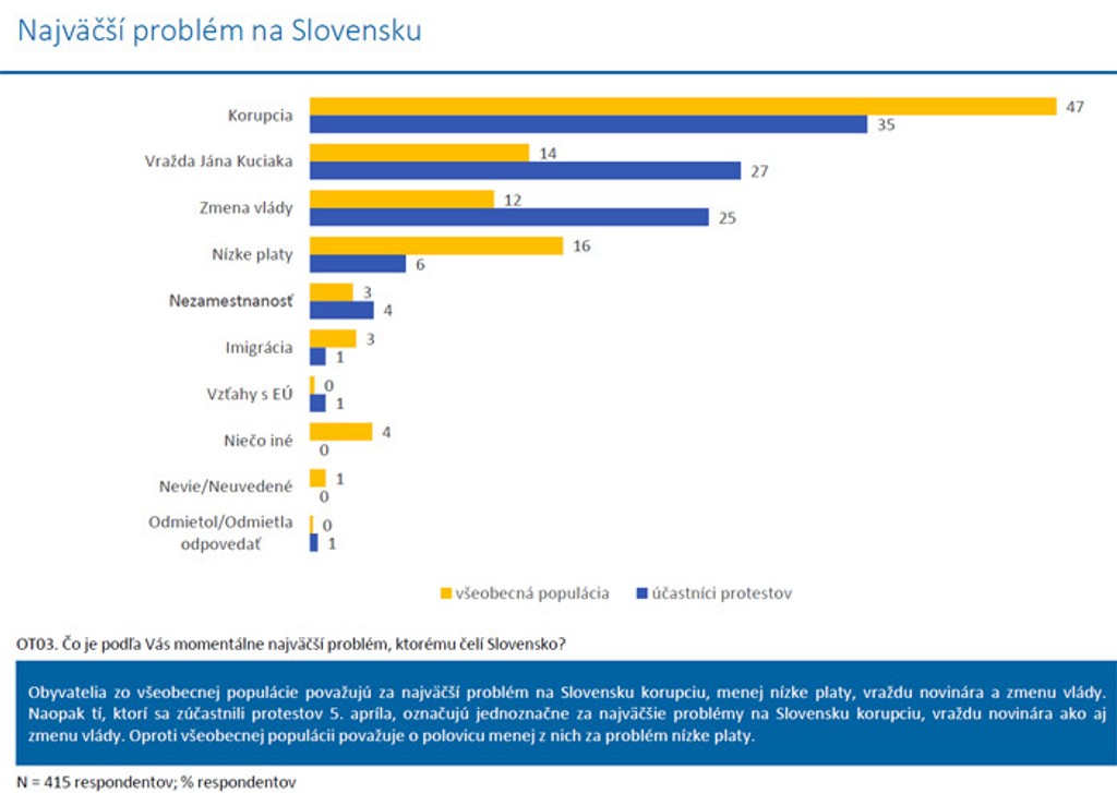 Takmer polovica zo všeobecnej populácie považuje za najväčší problém v krajine korupciu, výraznejšie menej vraždu novinára, zmenu vlády a nízke platy. Vo všeobecnosti sú za najmenšie problémy považované imigrácie, nezamestnanosť a vzťahy s EÚ.