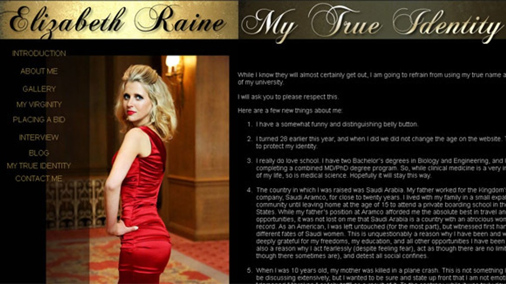 Študentka používa pseudonym Elizabeth Raine. Aukciu spustila v marci a potrvá až do 7. mája. Na stránke uviedla o sebe aj základné informácie. Je blondínka so zelenými očami. Má 178 centimetrov a 59 kilogramov.