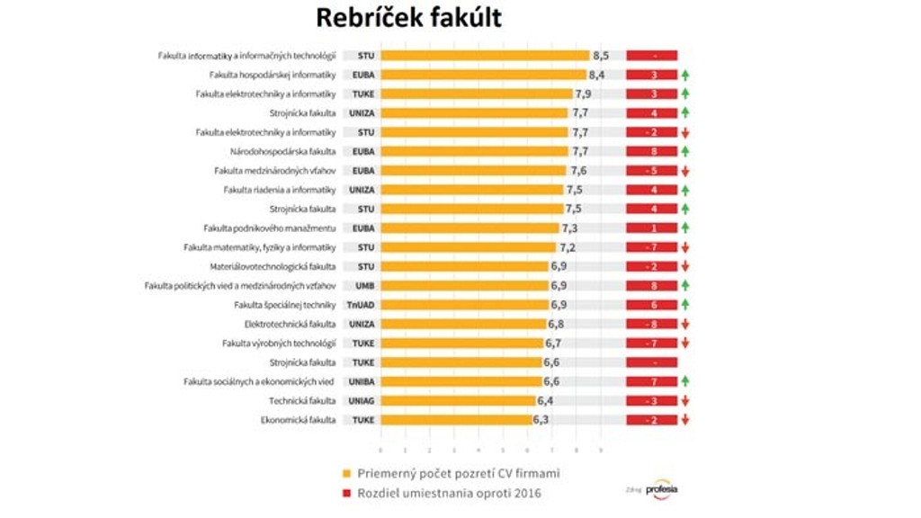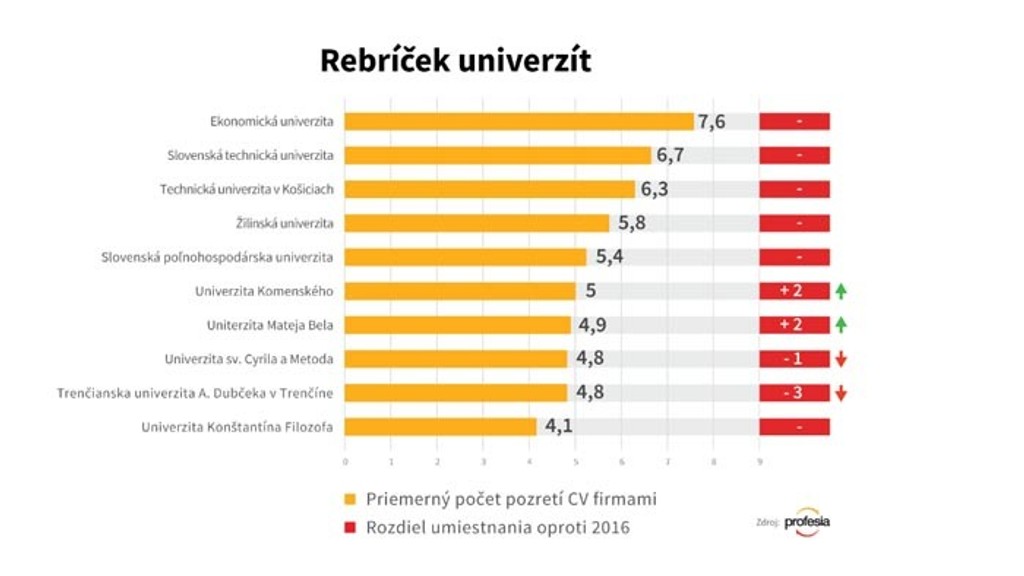 Profesia zostavila rebríček verejných vysokých škôl a fakúlt už po 11. raz. Umiestnenie závisí od toho, koľko zamestnávateľov si prehliada životopisy absolventov, ktoré boli uverejnené na pracovnom portáli Profesia.sk. Rebríček tak nehodnotí úroveň vyučovania, ale zameriava sa na uplatnenie jednotlivých absolventov na trhu práce.