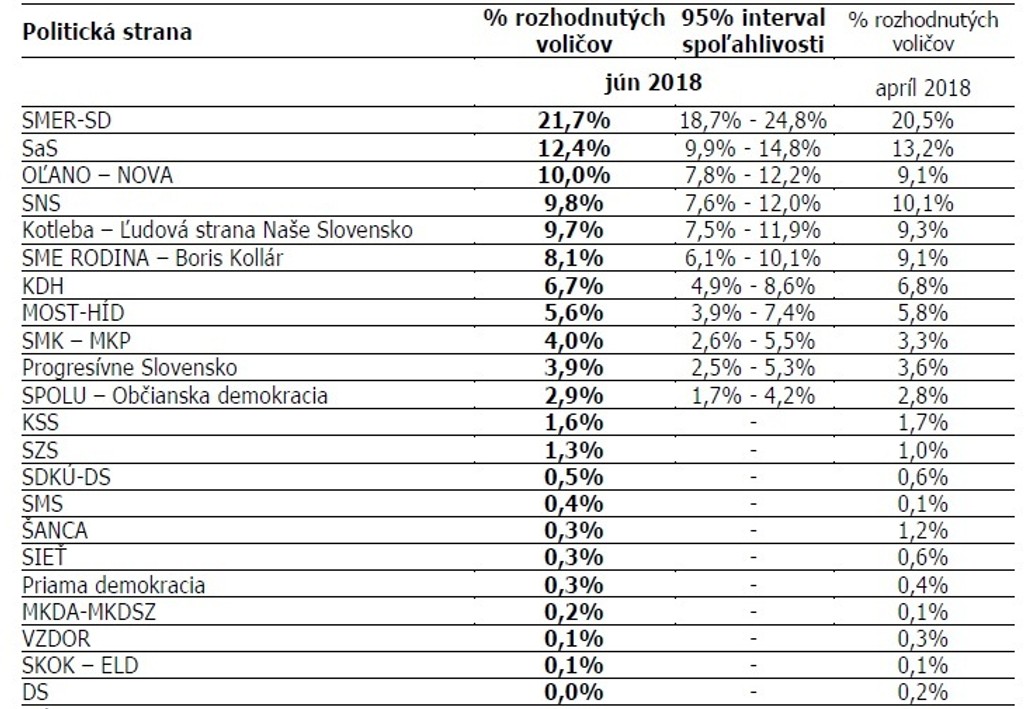 Ak by sa parlamentné voľby konali začiatkom júna, vyhral by ich opäť Smer-SD so ziskom 21,7 percenta hlasov.