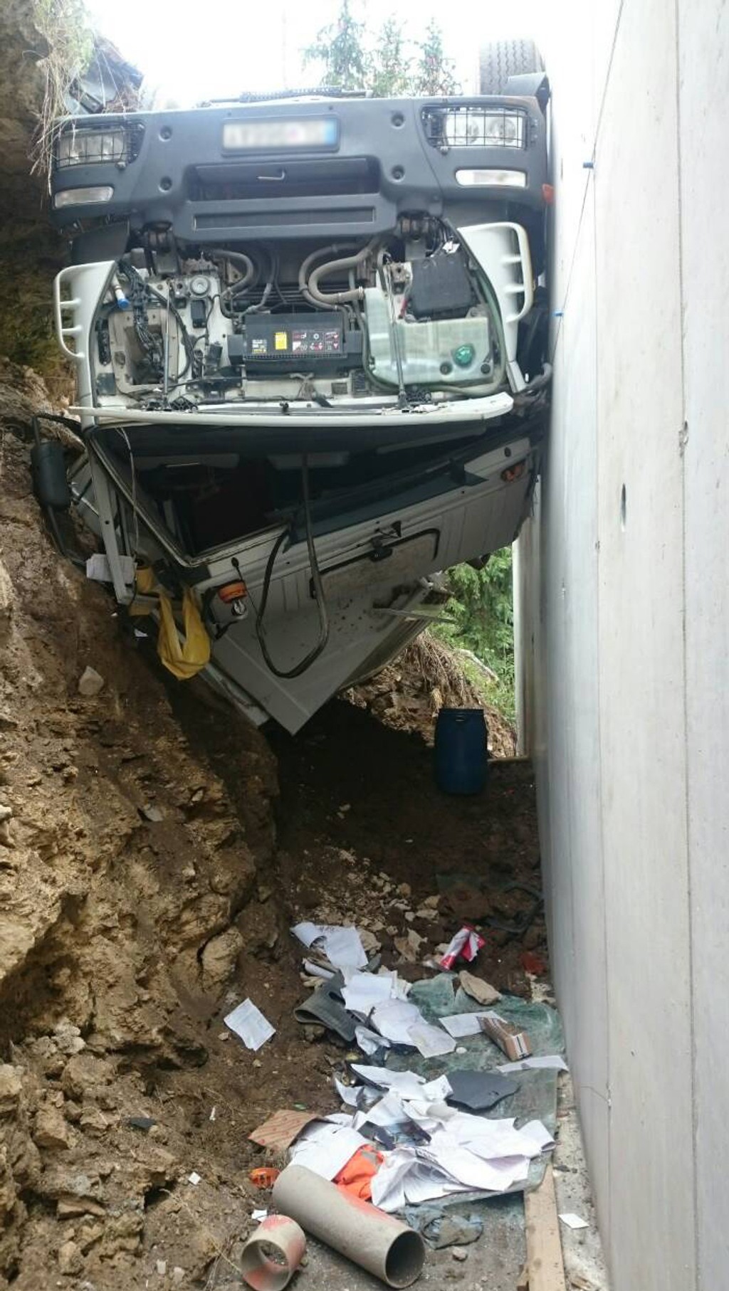 Vodič nákladiaka sa prevrátil tak nešťastne, že vozidlo zostalo zakliesnené medzi svahom a oporným múrom. Hasičom pripravil poriadny hlavolam.